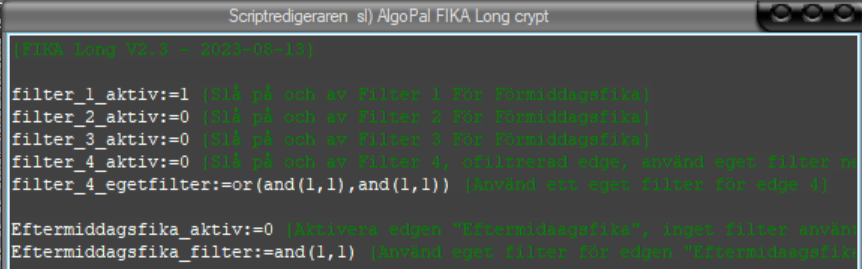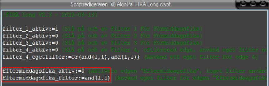 Som default så är filter 1 aktiv för Förmiddagsfika, om man vill stänga av ett filter så sätter man :=0 i stället för :=1.